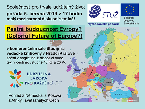 Společnost pro trvale udržitelný život pořádá 5. června 2019 v 17 hodin malý mezinárodní diskusní seminář v konferenčním sále Studijní a vědecké knihovny v Hradci KrálovéPestrá budoucnost Evropy? (Col...