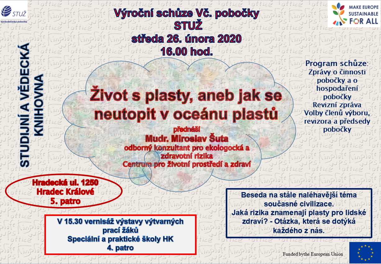 Východočeská pobočka STUŽ zve všechny zájemce na výroční schůzi pobočky spojenou s přednáškou MUDr. Miroslava Šuty na téma Život s plasty, aneb jak se neutopit v oceánu plastů.Vše se bude konat ve stř...