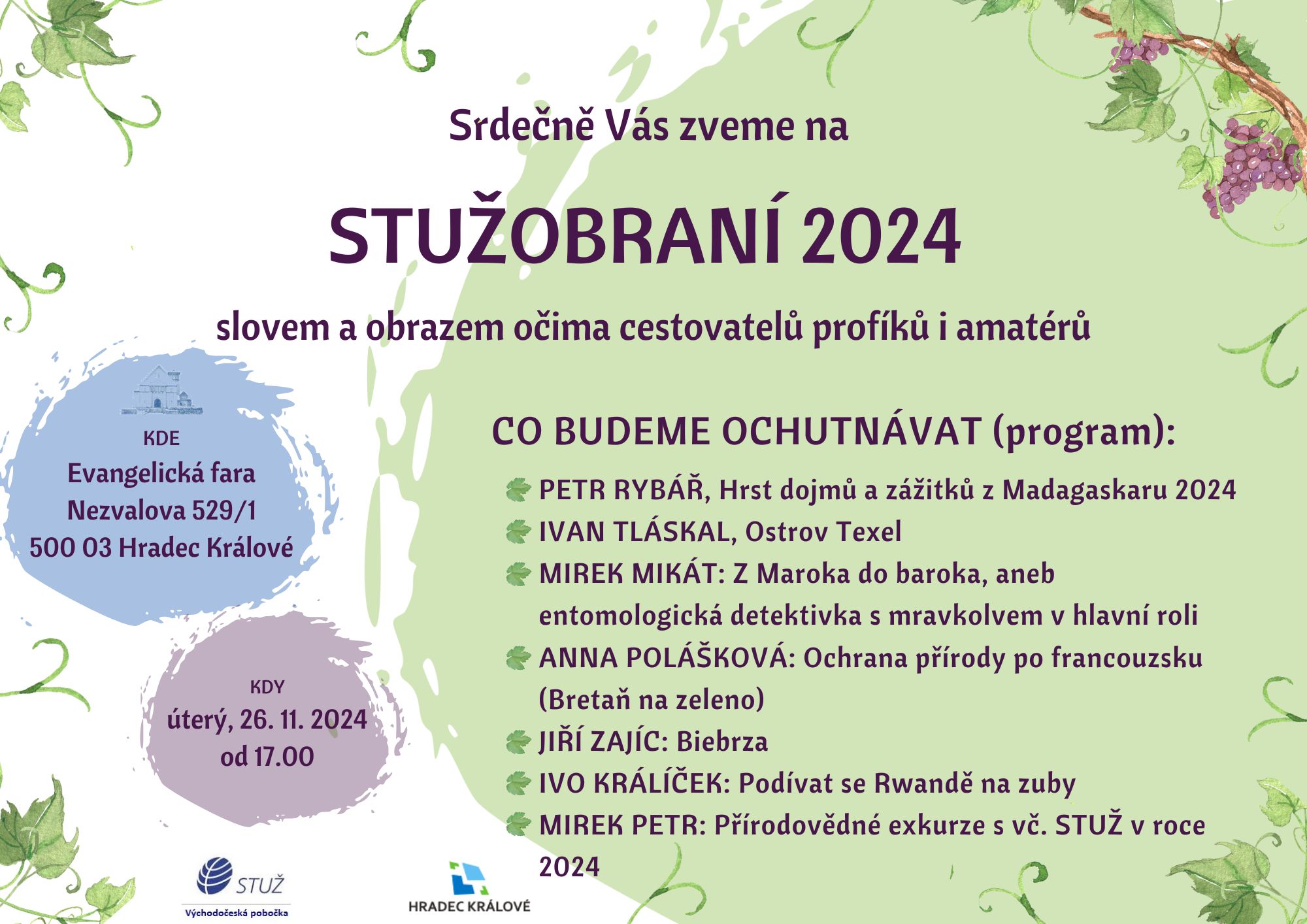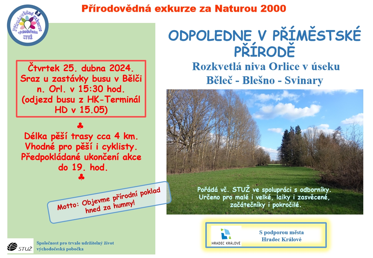 Východočeská pobočka zve na STUŽOBRANÍ, na tradiční podzimní obrázkovou sklizeň z cest, z katedrály přírody i lidských pelechů a hnízdišť. Koná se v úterý 26. 11. 2024 od 17.00 na evangelické faře v ...25. 4. od 15:30 Odpoledne v příměstské přírodě - Rozkvetlá niva Orlice v úseku Běleč - Blešno - Svinary